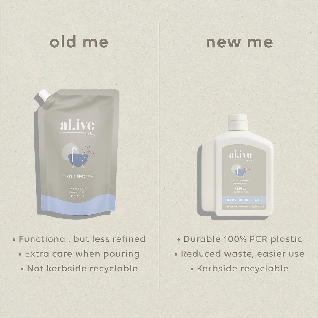 Each refill is designed to refill the 320ml al.ive baby Bubble Bath bottle twice, with a little to spare. Featuring a controlled-flow spout for mess-free pouring, a compact shape for easy storage, and full kerbside recyclability, it offers a practical, premium solution while extending the life of the product you already love.