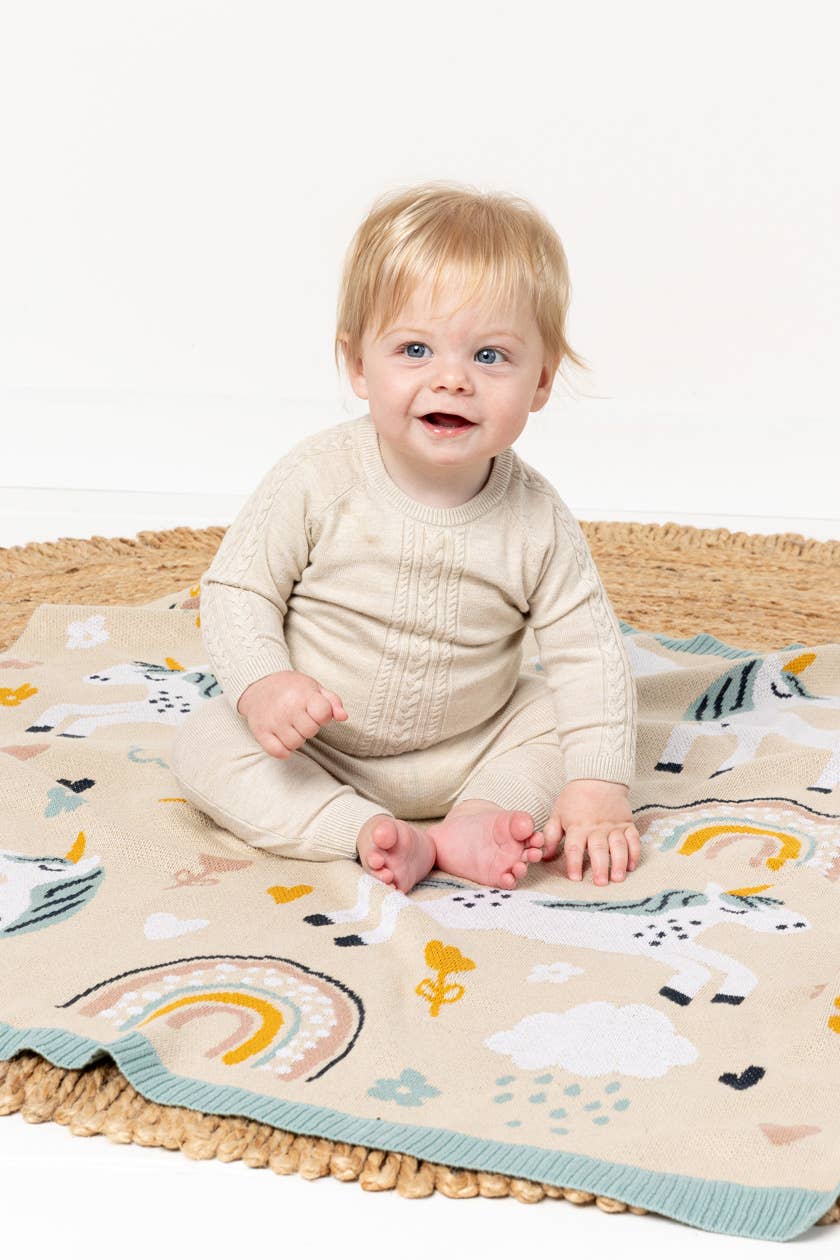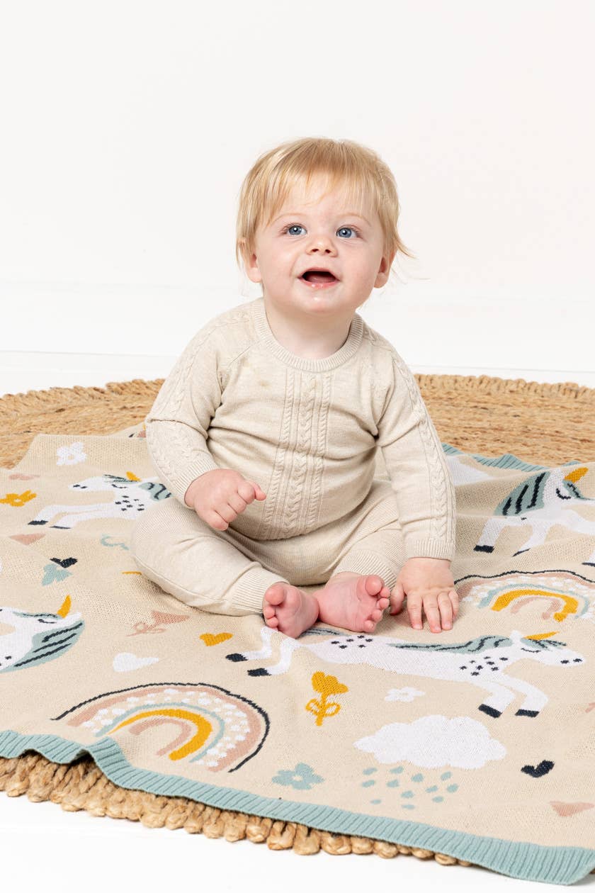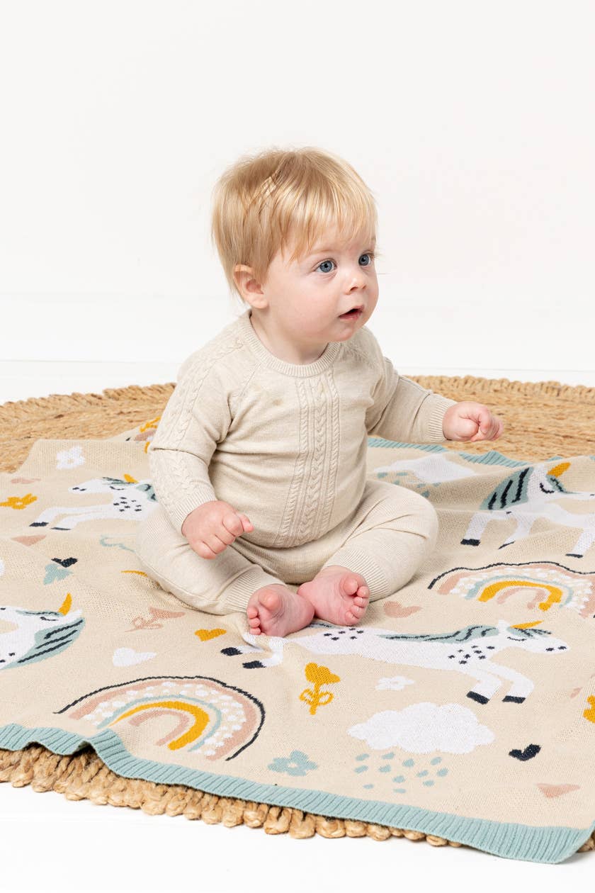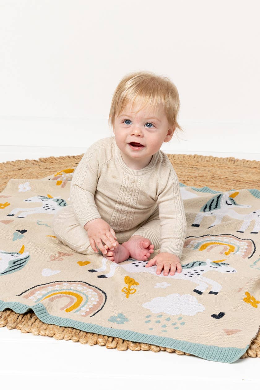 The Unicorn Magic Blanket is designed in Australia and crafted from 100% luxurious cotton knit, offering natural softness and breathability for little ones. Featuring adorable, character-inspired motifs, Indus Design baby blankets often draw from playful animals and sweet love-heart themes—this design is no exception.