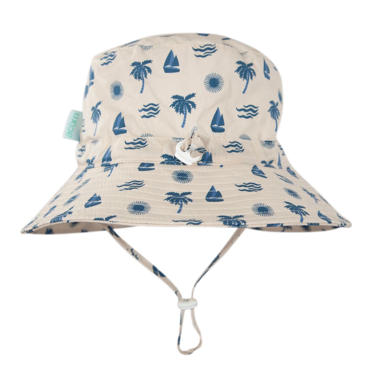 Bring the holiday vibes every day with this relaxed natural base bucket hat, featuring a charming blue tropical print of palm trees, boats, and suns — designed by Jacinta Weir of Two Little Ducklings. The print extends to the inner brim, creating a seamless and stylish look from every angle.