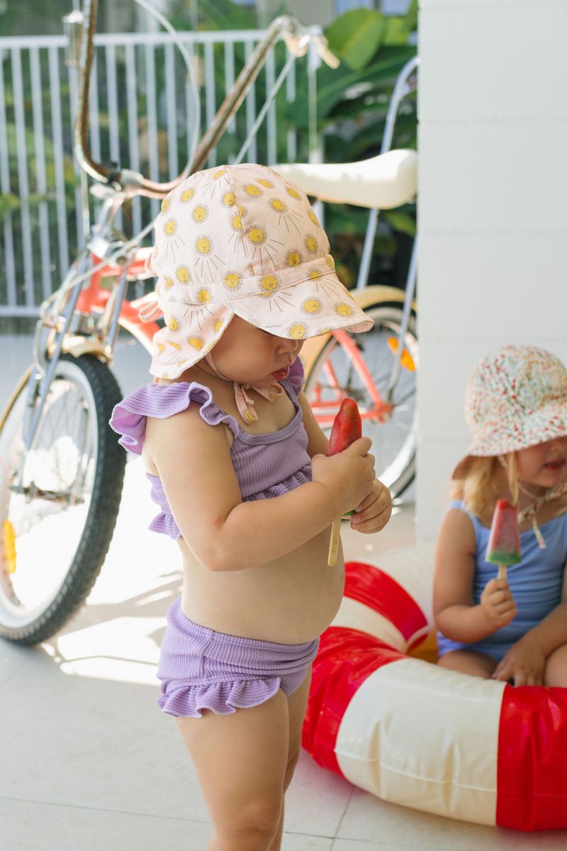 This flap cap with a peach base and golden smiling suns print is a beautiful way to keep little ones sun-safe. The sweet design was created by Melbourne artist Jacinta Weir from Two Little Ducklings.