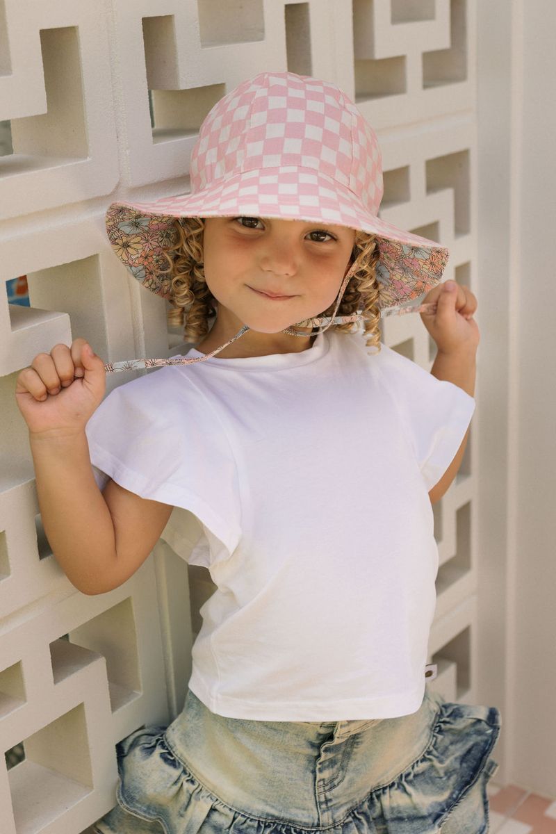 The sweetest reversible sunhat featuring a pink and peach floral print on the outside and our popular pink and cream checks print designed by Jacinta Weir of Two Little Ducklings.