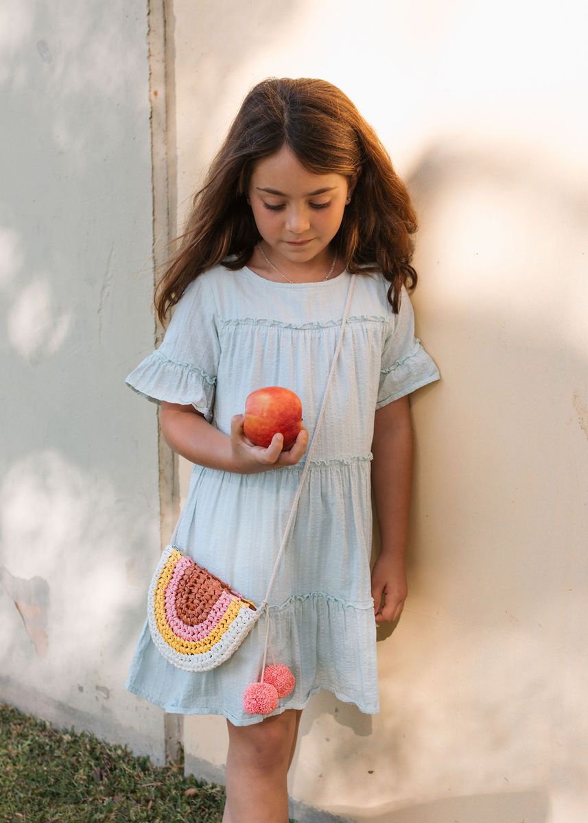 Brighten up any outfit with this playful straw bag! Featuring a fun rainbow body and sweet crossbody strap, it’s perfect for little ones on the go. The bag has a secure zip closure and is lined inside with a soft, tonal-coloured fabric to keep treasures safe.