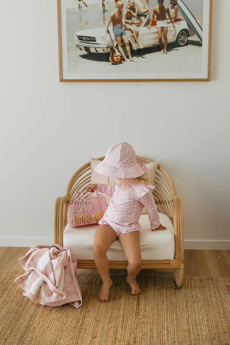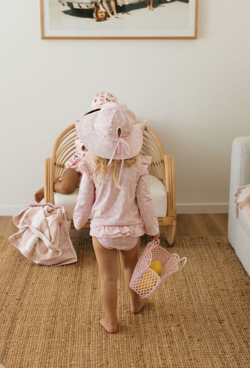 Dive into summer with this sweet pink daisy print swim hat, designed by Jacinta Weir from Two Little Ducklings. Perfect for keeping little heads shaded during all water adventures.