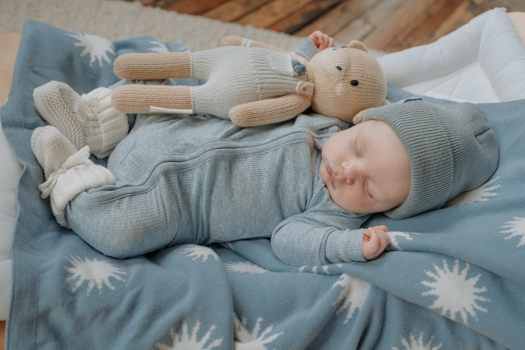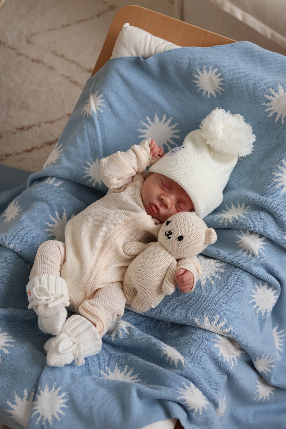 Stay cosy with our newest Knit Blanket, Celestial Blue.