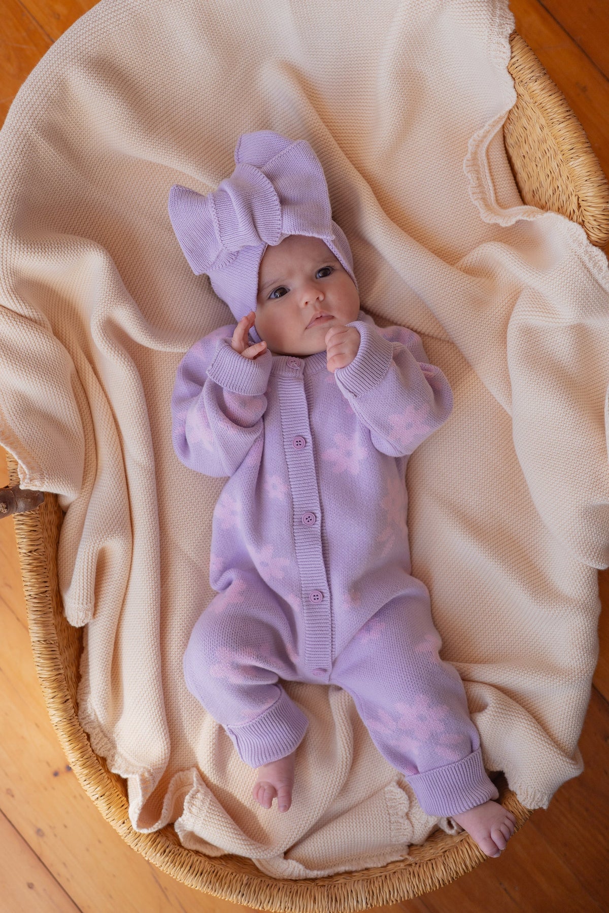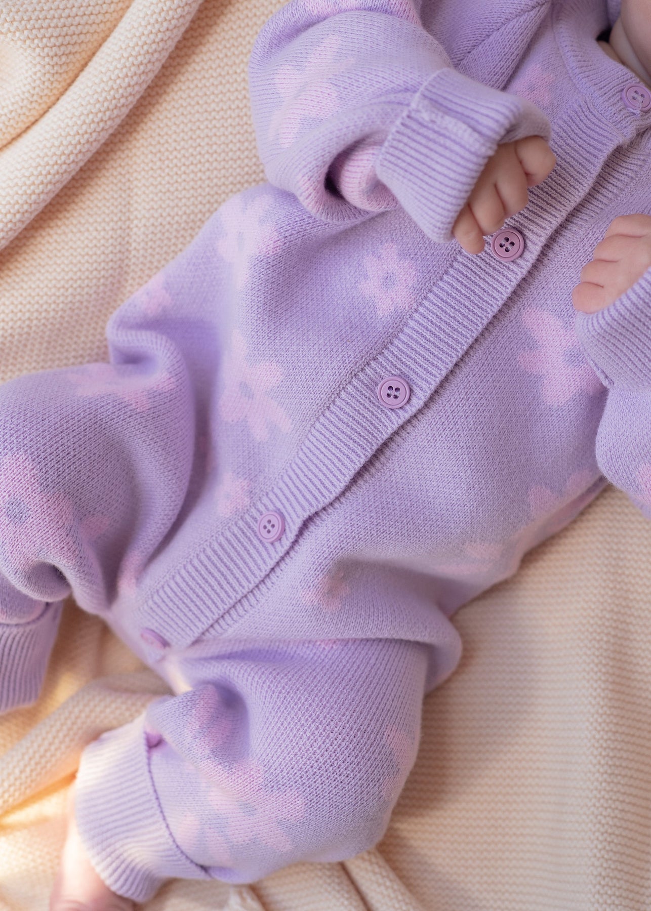 Our new classic knit romper features our Daisy Floral design in our brand new lilac colour way.