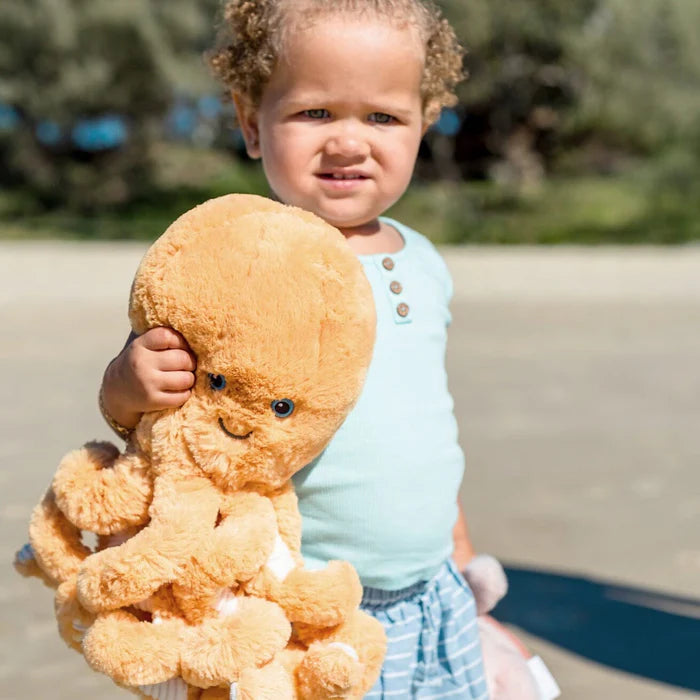 Our gold octopus plush toy is a great friend for your children. OB's sea creature toys are inspired by our coastal home and are a great snuggly friend for your little ones and their adventures. We are passionate about design and use a combination of master craftsmen and high-quality materials to create unique children's toy collections. Each soft toy comes with a sweet and fun bio. Perfect for gifting and a wonderful keepsake. Our soft toys are created for children of varying ages.
