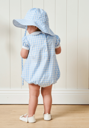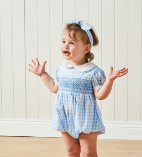 Smox Rox classic, white Peter Pan collar with hand stitched blue edging. Exquisite blue and white hand smocking on bodice. Hand stitched edge on puff sleeve. Pure white buttons at back. Stud crotch.