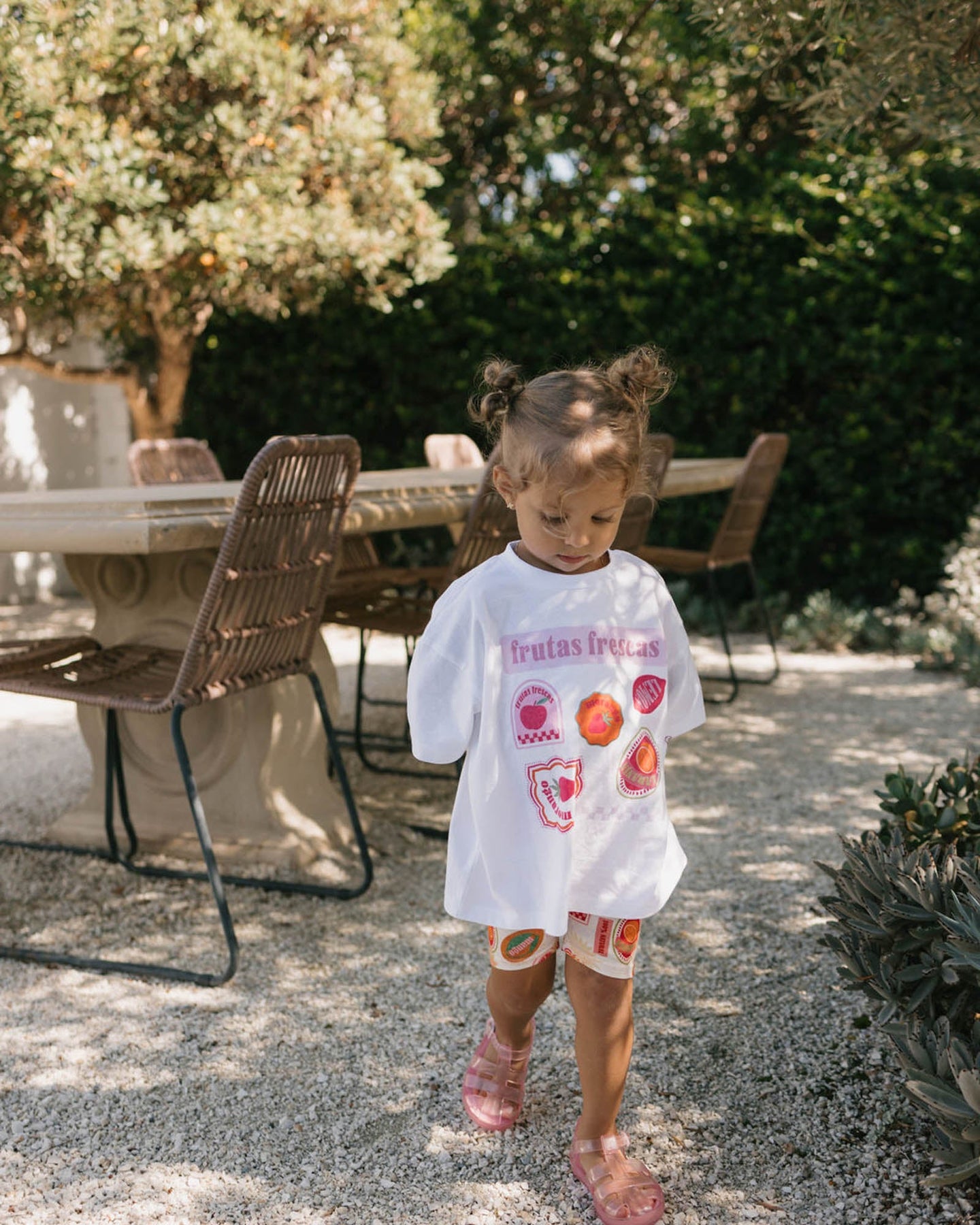 Sweet, juicy, and full of personality – the Felix Tee in Frutas Frescas is here to brighten up every outfit! Featuring an all-over fruit label print in vibrant retro hues, this classic tee silhouette is made from soft, breathable cotton that’s perfect for all-day adventures. Pair it with the matching Astrid Bike Shorts or mix it up with denim for a playful twist.