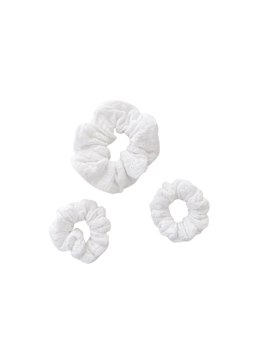 Lightweight cotton scrunchies in our Laurel broderie anglaise fabric.