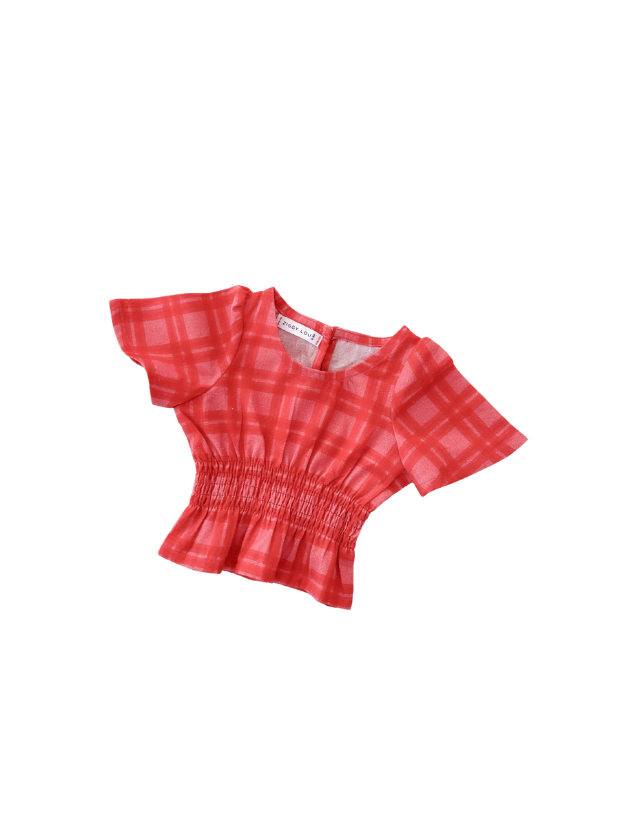 Cotton short sleeve top featuring our exclusive Jolie print. Functional button on the back of the neck for easy on/off, shirred elastic detail at waist. Mix and match with items from our Christmas Collection.