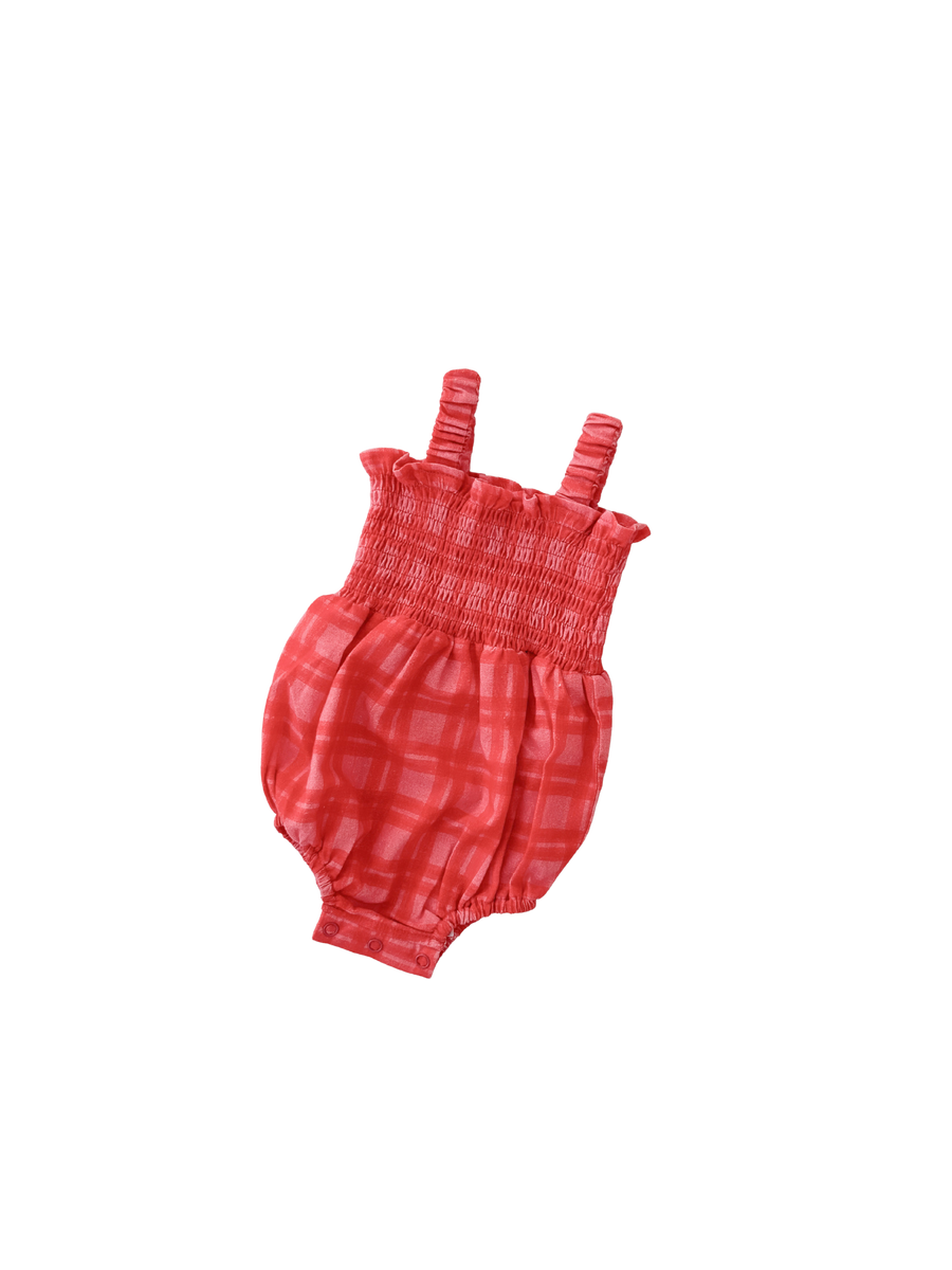 A lightweight cotton romper featuring our exclusive Jolie print. Shirred detailing across the bodice with adjustable button straps at back and snaps at the crotch for easy on/off and nappy changes. Mix and match with items from our Christmas Collection.