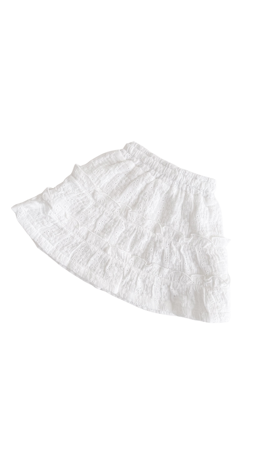 Cotton skirt in our Laurel broderie anglaise fabric with frill detailing and elastic waist. Mix and match with items from our Christmas collection.